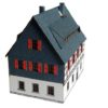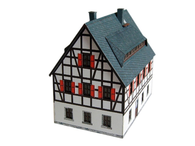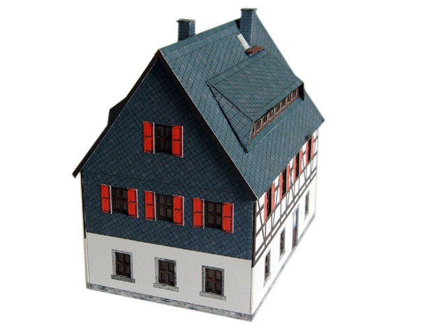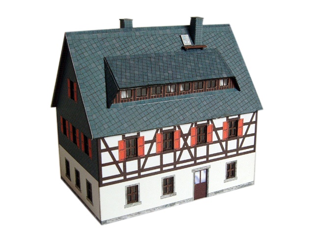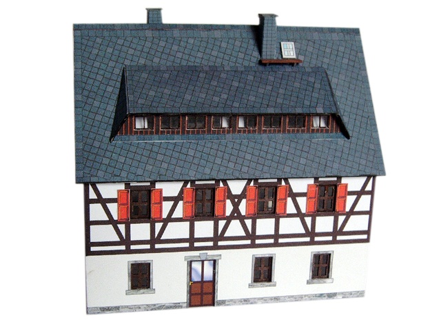 Komplett überarbeitetes Modell eines erzgebirgisches Fachwerkhaus um 1700, mit regional üblicher Schieferdeckung, Dachgauben und aufwändigem Fachwerk im Obergeschoß.