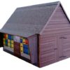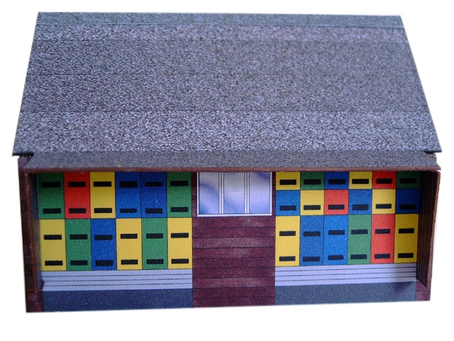 Modellbausatz eines traditionellen kleinen Bienenhauses aus Holz mit farbigen Bienenstöcken.