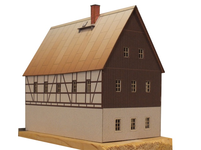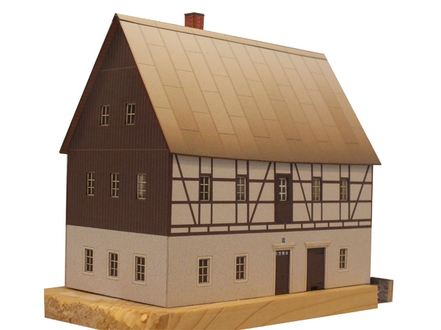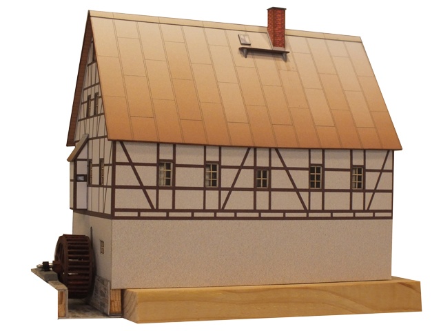 Erzgebirgisches Wohnhaus mit Ölmühle um 1800 mit Blechdach, Giebelverkleidung und einfach ausgeführtem Fachwerk im Obergeschoß. Es besteht die Möglichkeit, das Mühlrad elektrisch zu betreiben (Antriebe usw. sind aber nicht mit im Lieferumfang enthalten).